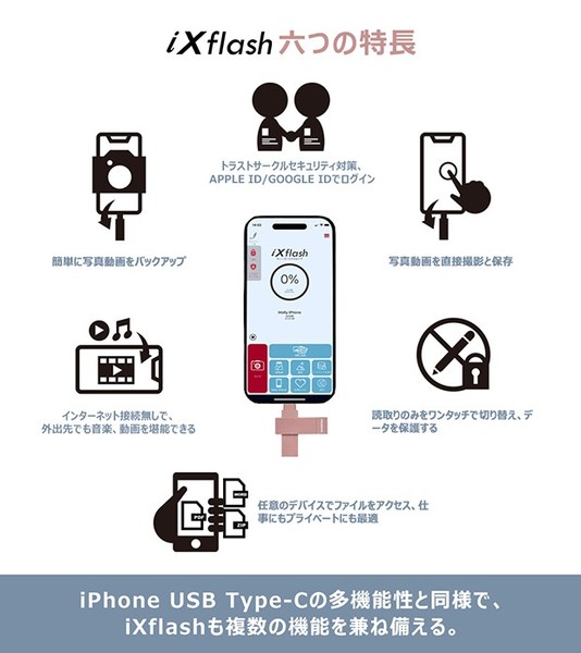 Apple iPhoneコネクタをLightningからUSB-Cに変更したことで、充電以外にも様々な新機能や拡張機能が利用可能になりました。USB-CケーブルでiPhone/iPadを簡単に充電できるだけでなく、他のデバイスの充電、ストレージ容量の拡張、外部モニターやキーボードの接続、ビデオゲームコントローラーの接続、イーサネットへの接続、マイクの増幅、多機能USB-Cハブ アダプタの接続などが可能になります。これらはすべてiPhoneを生かす生産性を向上させる非常に便利な機能ですが、このことから、当社の多機能製品iXflashなどiX関連商品について考えるようになりました。