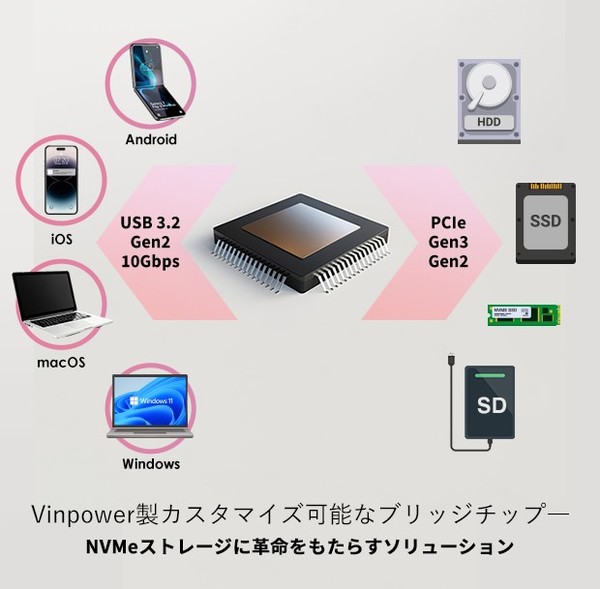 もし貴社製品がNVMe Gen 3 SSDとUSB 3.2 Gen 2インターフェースの接続を必要とするのであれば、Vinpowerのブリッジチップが最適解です。業界初となる先進機能を備え、他社との差別化を明確に打ち出します。