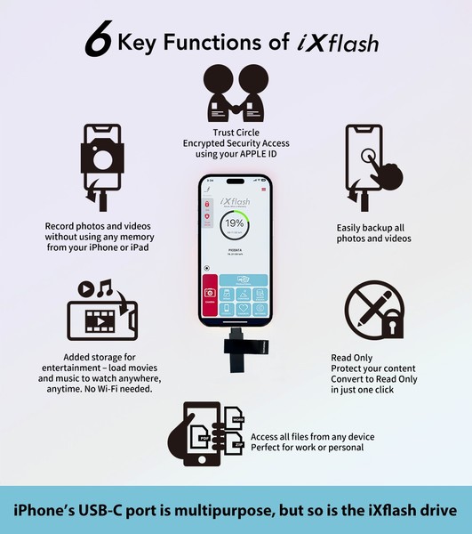 Once Apple converted the iPhone from a Lightning connection to USB-C, it enabled several new or enhanced capabilities beyond charging. Not only does it become easier to charge an iPhone and iPad with the same USB-C cable used by most other rechargeable devices, but they can also charge another device, increase the storage capacity, connect an external monitor and/or keyboard, plug in a video game controller, connect to the ethernet, amplify the microphone, and connect multi-faceted USB-C Hub Multiport Adapter. These are all incredibly useful features that will boost an iPhone’s productivity, but that got me to thinking about our own multi-functional product, the iXflash and other iX related flash drives for use with an iPhone or iPad.