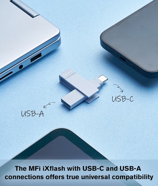 With USB Type-C now the go-to standard for smartphones, tablets, and computers, staying connected across all your devices is more important than ever. That’s why the latest iXflash includes both USB Type-A and USB Type-C connectors—delivering wide-ranging compatibility with iPhones, iPads, Android devices, laptops, smart TVs, car stereos, and more.